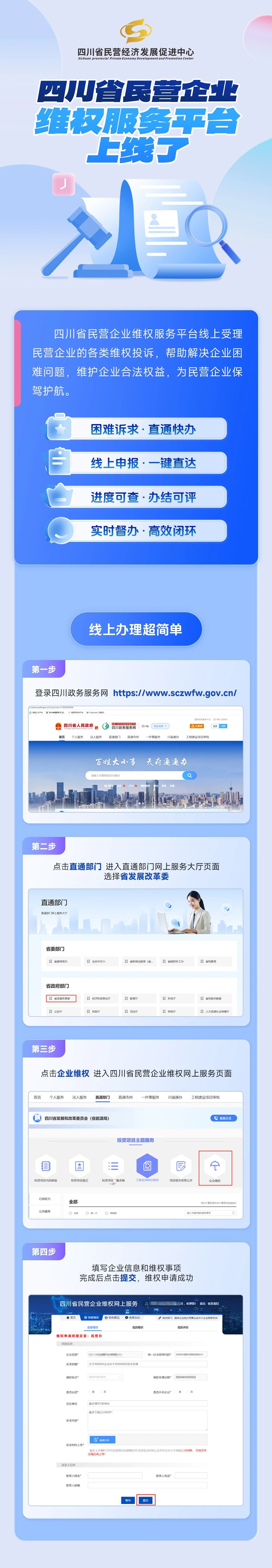 据介绍,该平台将线上受理民营企业的各类维权投诉,帮助企业解决困难问题。企业可通过以下路径登录使用:登录“四川政务服务网”——点击“直通部门”——选择“省发展改革委”——点击“企业维权”入口进入,填写企业信息和维权事项。